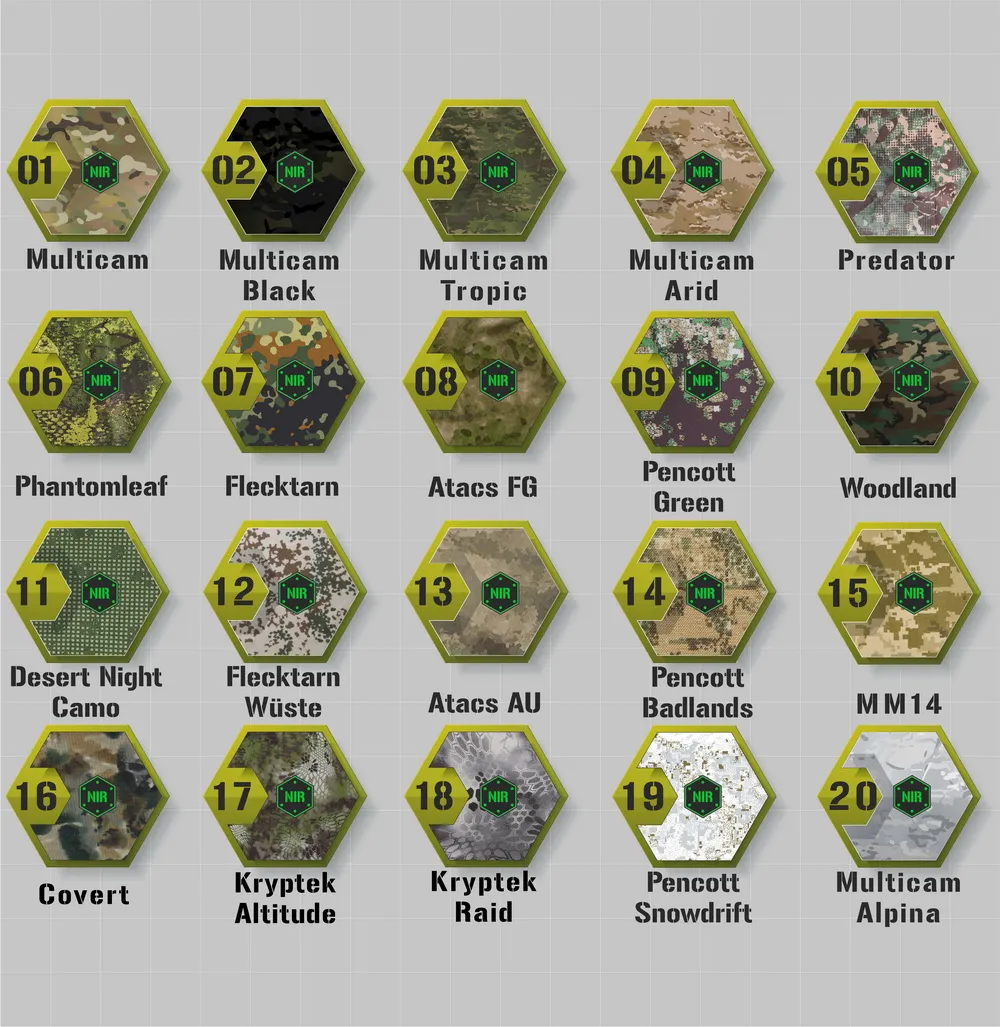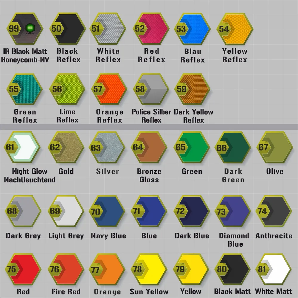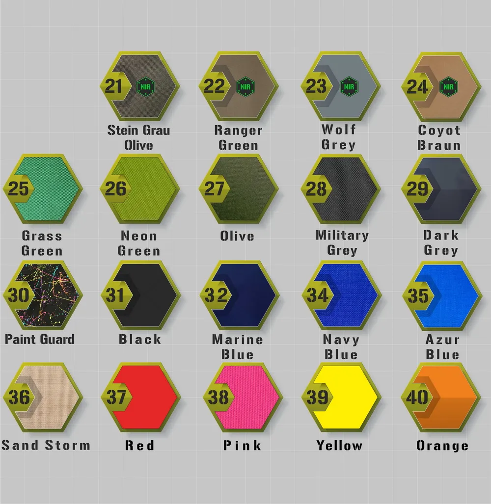 Hier sind alle verfügbaren Farbvarianten der Materialien Cordura und Folien dargestellt, aus denen wir individuelle Patches anfertigen.